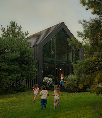 Minimalistyczna bryła ukryta w zieleni daje poczucie prywatności i bliskości natury. Duże przeszklenia łączą wnętrze z ogrodem, a przestrzeń wokół domu zachęca do swobodnej zabawy i odpoczynku na świeżym powietrzu.